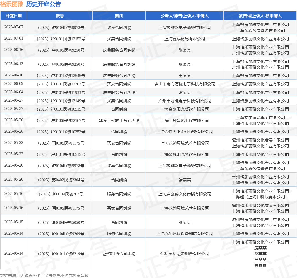案号:(2025)浙0109民初3244号审理法院:杭州市萧山区人民法院案由:合同纠纷当事人信息: 原告/上诉人:石家庄君诚雕塑工程有限公司 被告/被上诉人:杭州格乐丽雅文化产业有限公司、上海格乐丽雅文化产业有限公司开庭日期:2025年5月14日根据统计,近一年内以上海格乐丽雅文化产业有限公司为当事人的历史开庭公告有178则,其中案由为“买卖合同纠纷”的公告以61则居首,其次为“服务合同纠纷”有36则,“合同纠纷”有21则。历史开庭公告(前20条)如下: